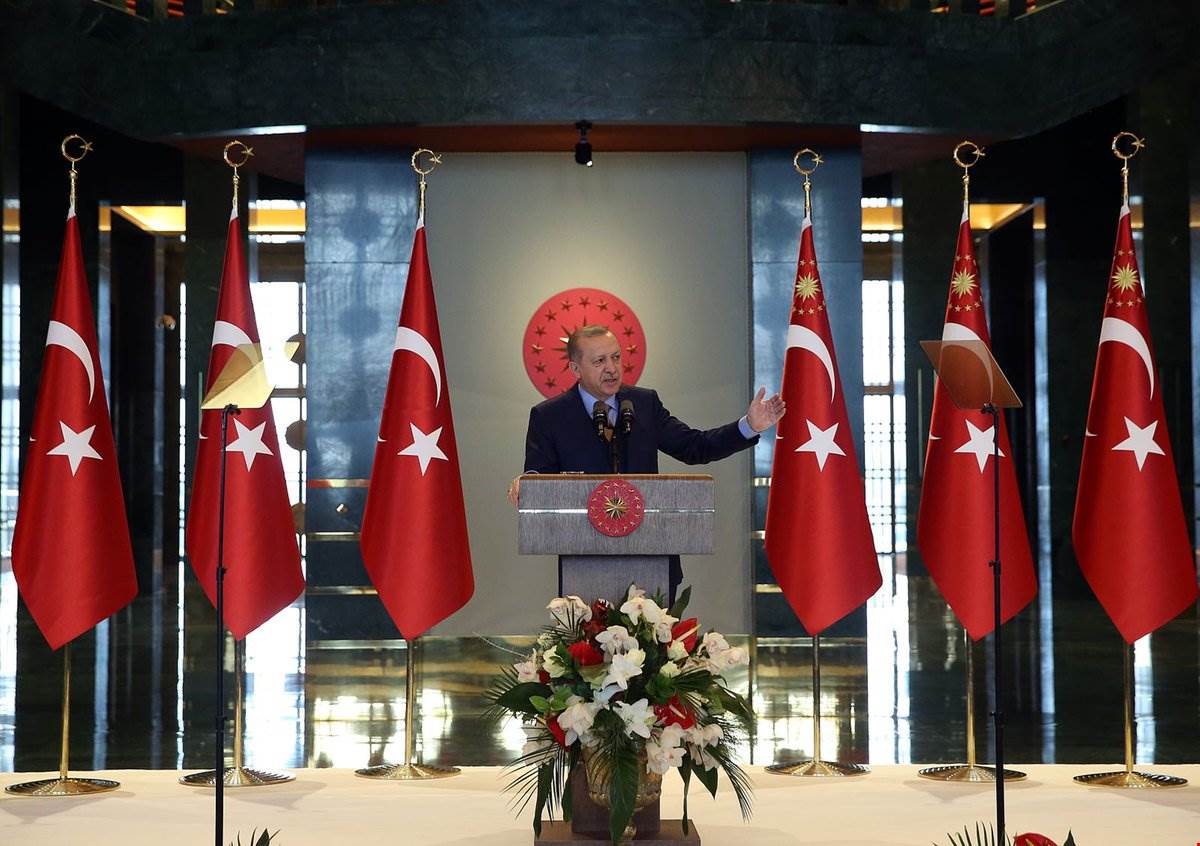 Cumhurbaşkanı Erdoğan, konuşmasını şöyle sürdürdü: “Türkiye hem içeride, hem dışarıda bütün yuvalanmış terör örgütleri ve onları destekleyen güçlerle hayati bir mücadele yürütüyor. Bu mücadelenin daha uzunca bir süre de devam edeceği anlaşılıyor. Şu ana kadar hamdolsun bizi hedef alan oyunların hepsini de bozduk, bize kurulan tuzakların hepsini de boşa çıkarttık. Bu yıldan başlayarak önümüzdeki dönemde milletimizin birliğine, beraberliğine, kardeşliğine yönelik saldırıların katlanarak artması kuvvetle muhtemeldir. Kimi zaman inanç, kimi zaman mezhep; bakın en büyük tehlike bu, onu da söyleyeyim. Şu anda mezhebi noktada bir yapılanmayı şiddetle yürütenler de var, bunu özelikle bilmenizi istiyorum. Etnik unsurları şu anda egemen kılamayanlar, şimdi mezhebi olarak bu işi yürütmenin gayreti içerisindeler. Kimi zaman meşrep, kimi zaman yine söylüyorum köken, kimi zaman daha başka farklılıklar, bütün bunlar üzerinden saldırılar başlatılıyor veya başlatılacak, onun için sizlere büyük görev düşüyor.”