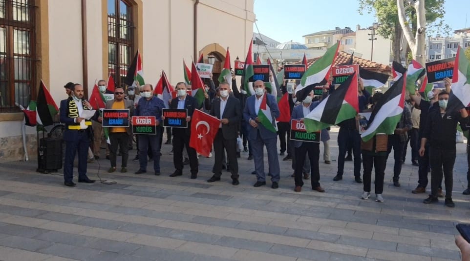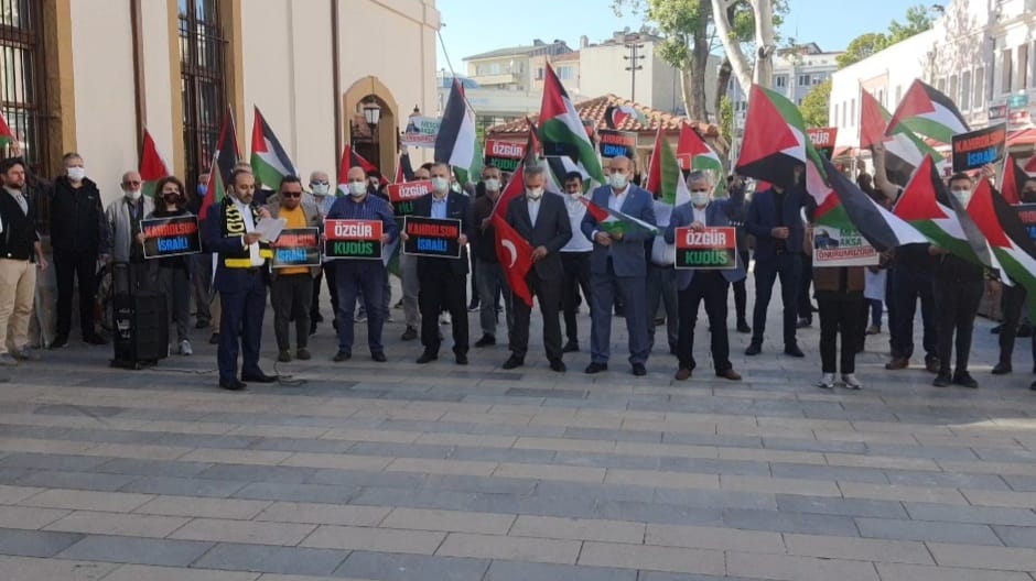 Orhan Cami önünde ikindi namazı sonrası yapılan açıklamada, İsrail güçleri tarafından Mecid-i Aksa’ya yapılan baskın telin edilrek “ Bir takım anlaşmalarla , kınamalarla bu sorun çözülemez. ” denildi.