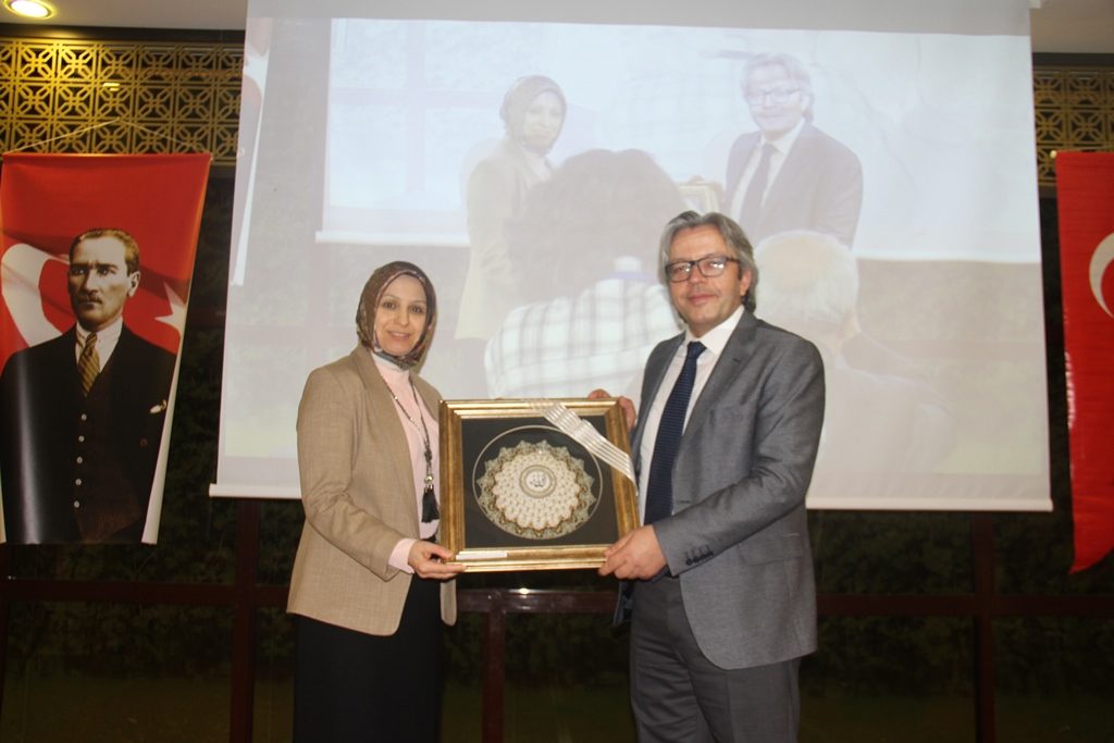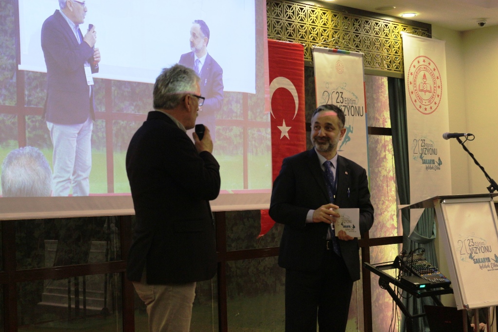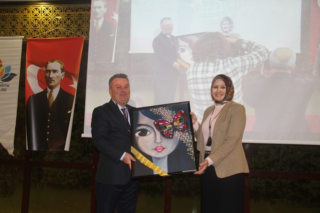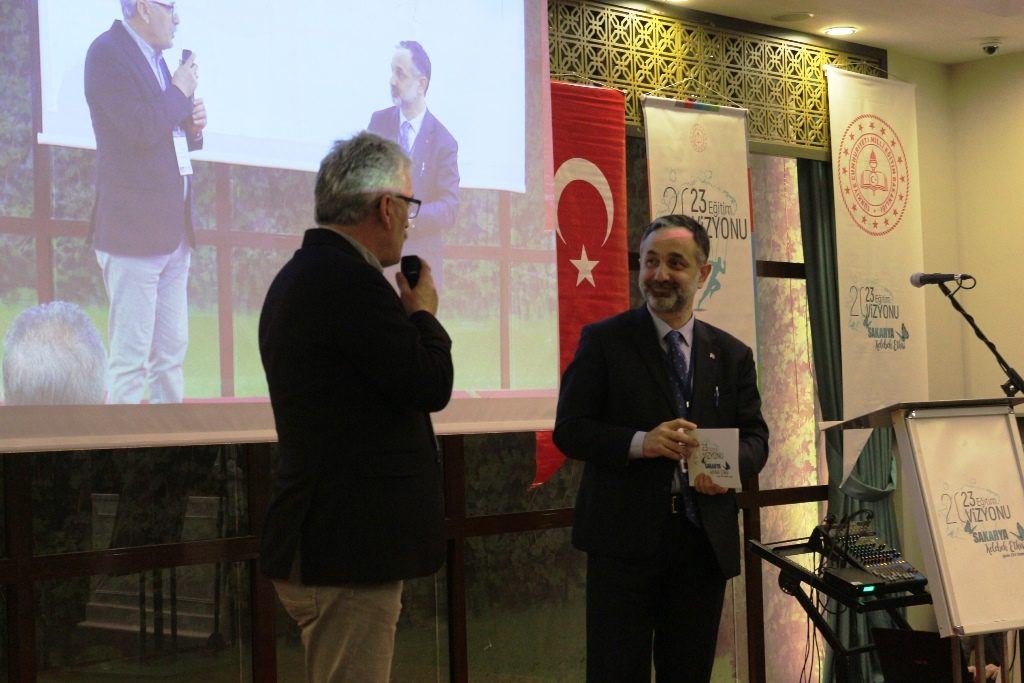 ‘Güçlü Türkiye İçin Mesleki Eğitim’ konusunun ele alındığı çalıştayda İl Milli Eğitim Müdürü Fazilet Durmuş Bakan Danışmanı Adem Çilek’e meslek lisesi öğrencileri tarafından yapılan bir çalışmayı hediye ederken, Adapazarı Mesleki Eğitim Merkezi Müdürü Arif Türkyılmaz da çırak öğrenciler tarafından yapılan bir tabloyu İl Milli Eğitim Müdürü Fazilet Durmuş’a hediye etti.