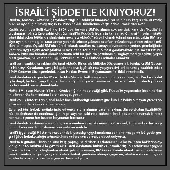 İsrail’in 4 gündür Filistin halkına karşı yaptığı saldırıları; uluslararası hukuka ve insan haklarına aykırılığını hep birlikte dile getirmekle İsrail devletinin hukuk ve insanlık dışı bu saldırısını aşağıda imzası bulunan baro başkanları olarak şiddetle kınıyor, BM Genel Kurulu olmak üzere uluslararası tüm kurumları, engelleyici yaptırımları derhal gündeme almaya çağırıyor, uluslararası kamuoyunu Filistin halkı için harekete geçmeye davet ediyoruz.