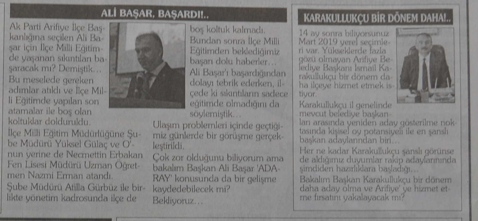 Sakarya Halk Gazetesi köşe yazarı Mehmet TAŞTAN’ın gazetede bu hafta yayınlanan‘Pazar Yazıları’ köşesinde Ariifye İlçe Milli Eğitimde son gelişmeler ve Başkan Karakullukçu’yu yazdı…