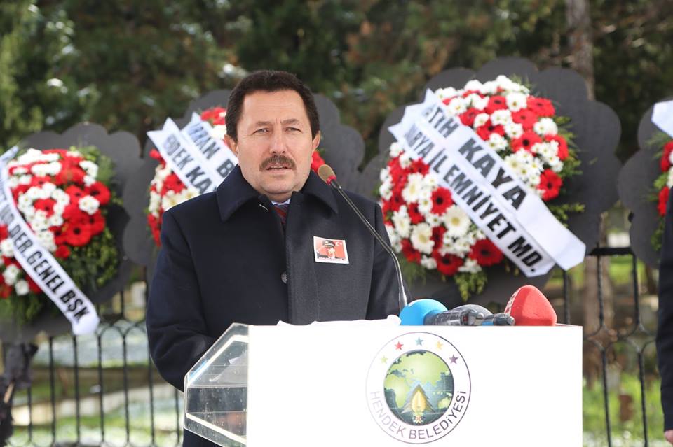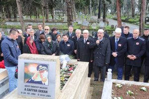 Şehit Emniyet Müdürü Ali Gaffar Okkan’ın eşi Zerrin Okkan, eşinin mezarına kızıyla birlikte aile bireylerini temsilen 5 karanfil bıraktı. Saygı duruşunda bulunulması ve İstiklal Marşı’nın okunmasının ardından Şehit Emniyet Müdürü Ali Gaffar Okkan’ın özgeçmişi okundu. Törende ilk konuşmayı yapan Hendek Belediye Başkan Yardımcısı Ahmet Kavakçı, Ali Gaffar Okkan’ın 17’inci ölüm yıldönümünde bu kadar insanın mezarı başında anma törenine katılmasının Ali Gaffar Okkan’ın ne kadar sevilen ve gönüllerde yer eden bir insan olduğuna dair en önemli gösterge olduğunu söyledi. Kavakçı, “Bundan 17 yıl önce 2001’de 5 silah arkadaşıyla birlikte hain bir saldırı sonucu şehit olan Hendek’imizin evladı, değerli büyüğümüz şehit Ali Gaffar Okkan’ı anmak için toplandık. Şehir dışından ilçemize gelen şehit müdürümüzün dostlarına ve şehidimizin her zaman kalbinde dolaşan Hendek’lilere hoş geldiniz diyorum. Ülkemiz vatan ve bayrak uğruna birçok şehitler vermiştir, ilçemiz de tıpkı Gaffar Okkan gibi şehitler vermiştir vatanımızın bekası için her durumda silahlı kuvvetlerimiz ellerinden gelen mücadeleyi yapmaktadırlar. Tıpkı şu anda Zeytin Dalı operasyonu gibi şanlı ordumuz ülkemizin bekası için Afrin’de yeni bir desten yazmaktadır. Burada şehit olan askerlerimize rabbimden rahmet diliyorum” dedi.