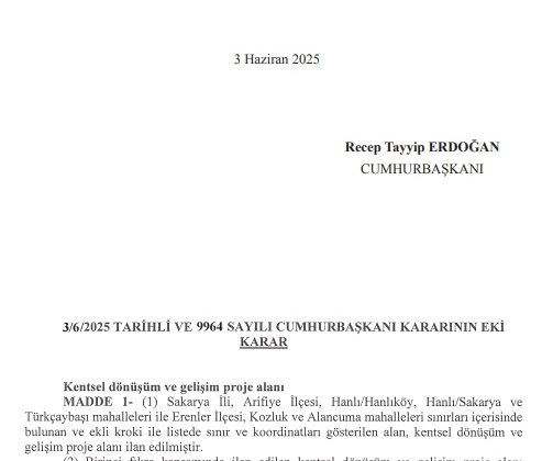Sakarya Büyükşehir Belediye Başkanı Yusuf Alemdar, Cumhurbaşkanı Recep Tayyip Erdoğan’ın imzasıyla Resmî Gazete’de yayımlanan “kentsel dönüşüm ve gelişim proje alanı” ile ilgili müjdeyi kamuoyu ile paylaştı.