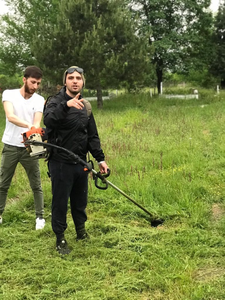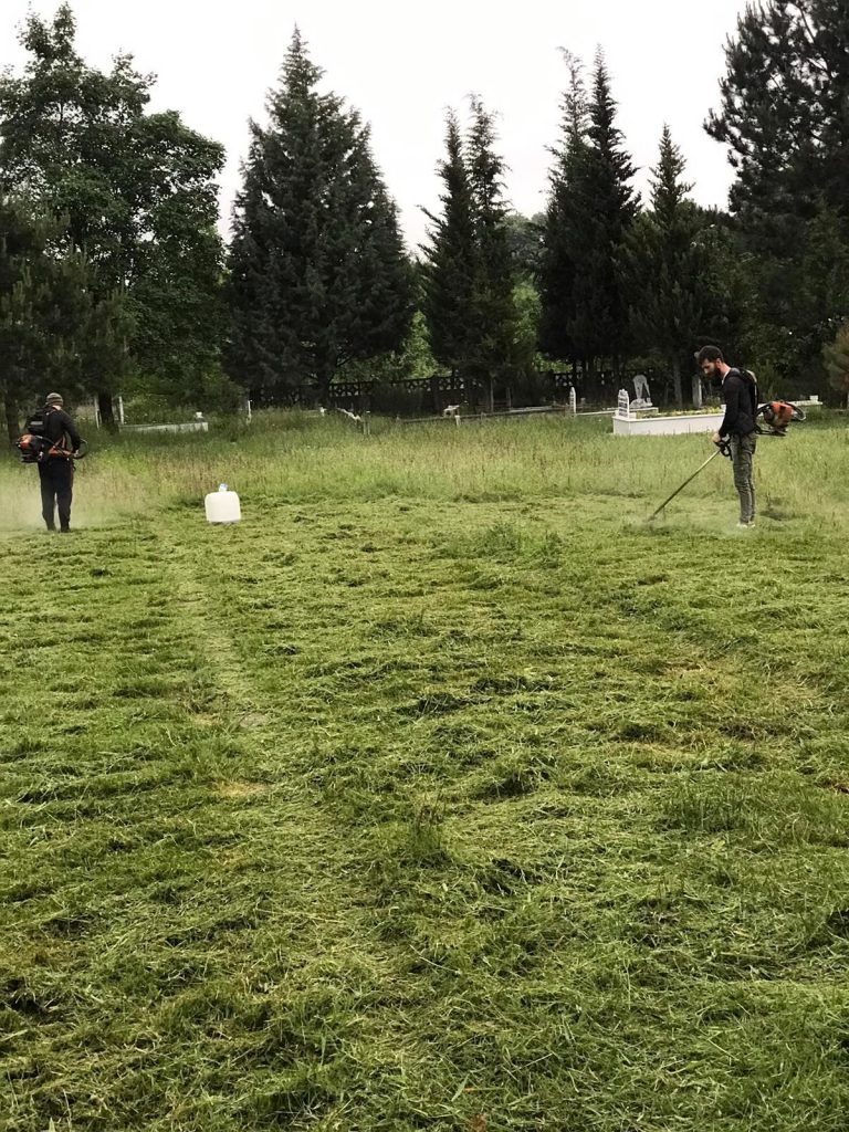 Gençler Ot motoru, tırmık, kürek gibi aletlerini de yanlarına alarak köy mezarlığında yeni tip koronavirüs mücadelesi kapsamında sosyal mesafe kuralına uyarak bir araya geldi.