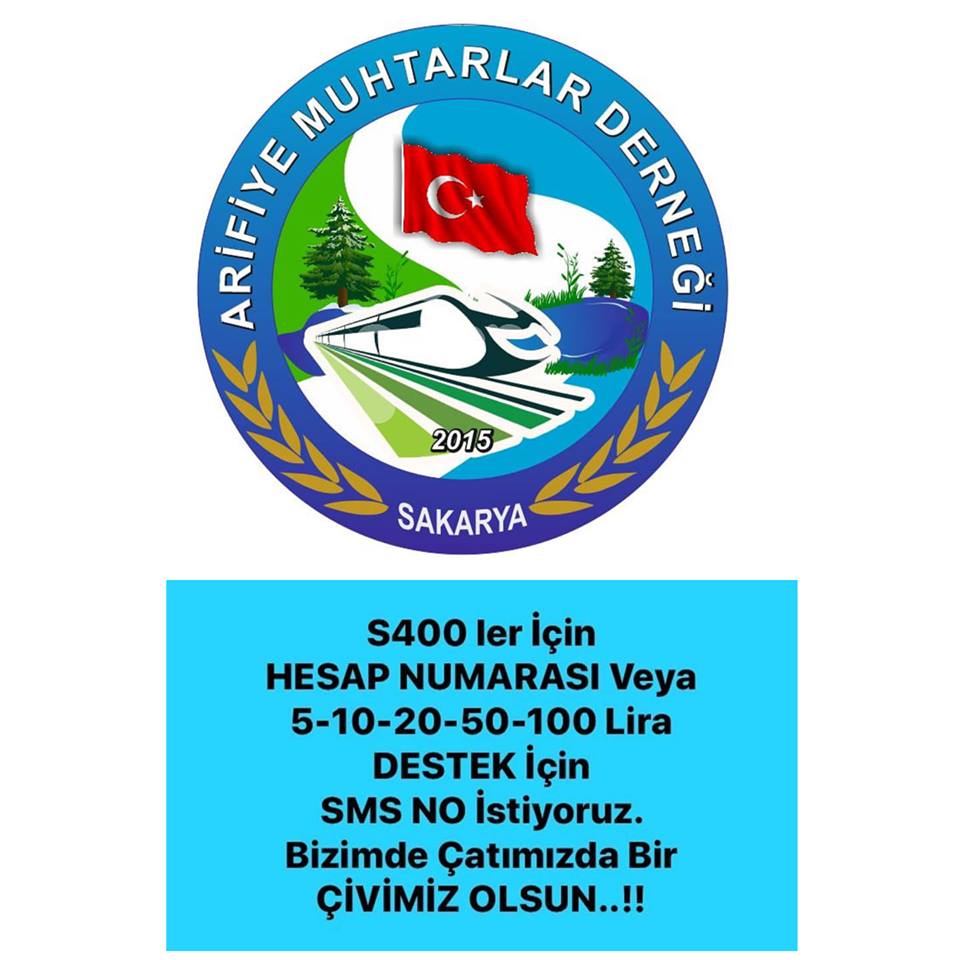 ‘Cumhuriyet Mahallesi Muhtarı ve Arifiye Muhtarlar Derneği Başkanı Yusuf Yavuz yaptığı paylaşımında ,’S-400’ler için hesap numarası veya 5-10-20-50-100 lira destek için SMS no istiyoruz.Bizimde Çatımızda bir çivimiz olsun.Arifiye Muhtarlar Derneği daima devletimizin hizmetindedir.Biz hazırız‘ ifadelerini kullandı.