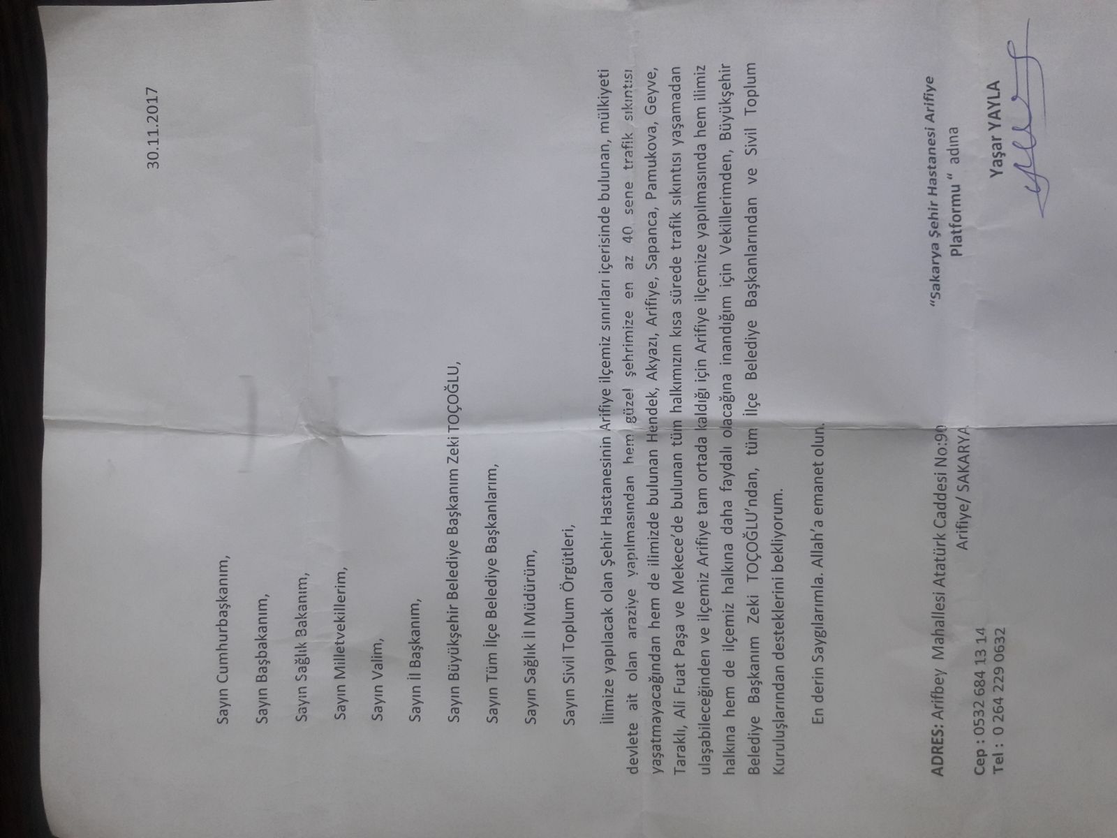 İlimize yapılacak olan Şehir Hastanesinin Arifiye ilçemiz sınırları içerisinde bulunan,mülkiyeti devlete ait olan araziye yapılmasından hem güzel şehrimize en az 40 sene trafik sıkıntısı yaşatmayacağından,hemde ilimizde bulunan Hendek,Akyazı,Arifiye,Sapanca,Pamukova,Geyve,Taraklı,Alifuatpaşa ve Mekece’de bulunan tüm halkımızın kısa sürede trafik sıkıntısı yaşamadan ulaşabileceğinden ve ilçemiz Arifiye tam ortada kaldığı için Arifiye ilçemize yapılmasında hem ilimiz halkına hemde ilçemiz halkına daha faydalı olacağına inandığım için Vekillerimden,Büyükşehir Belediye Başkanım Zeki Toçoğlu’ndan,tüm İlçe Belediye Başkanlarından ve sivil toplum kuruluşlarından deteklerini bekliyorum.