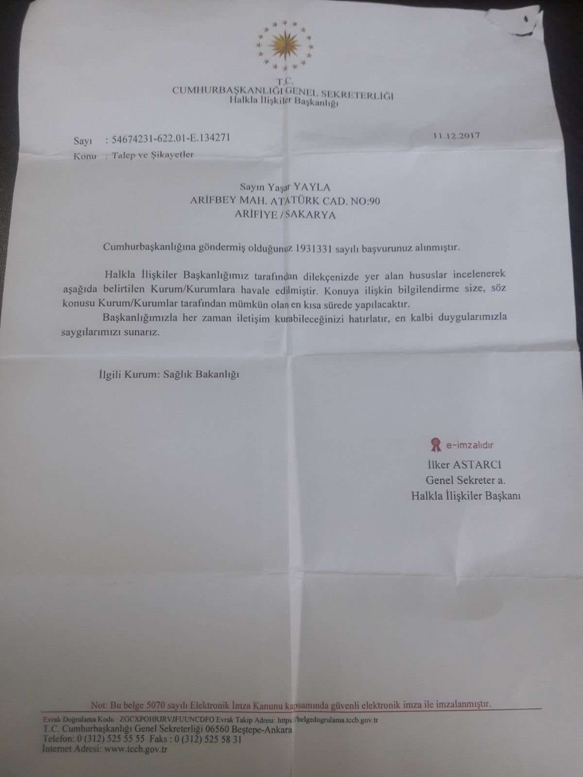Sakarya Şehir Hastanesi Arifiye Platformu’ adına geçtiğimiz günlerde bir açıklama yapan ve talebini Cumhurbaşkanlığına kadar ileteceğini belirten Yaşar YAYLA’ya cevap geldi.