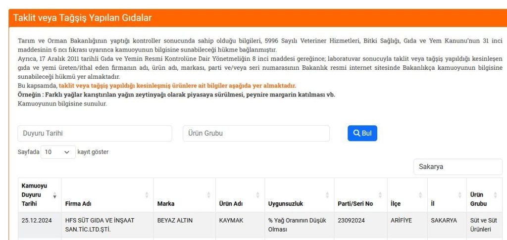 Tarım ve Orman Bakanlığı’nın güvenilir gıda politikası kapsamında düzenli olarak güncellediği taklit ve tağşiş listesine, Sakarya’dan bir firma daha eklendi. Sağlığı tehlikeye düşürebilecek ürünlerin yer aldığı liste, Bakanlığın guvenilirgida.tarimorman.gov.tr internet sitesi üzerinden kamuoyuyla paylaşılıyor.