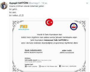 Arifiye İlçe Kaymakamlığı ve Arifiye Belediyesinin birlikte organize ettiiği program için Şehidimizin eşi Ayşegül Safitürk’e de davetiye gönderildi.