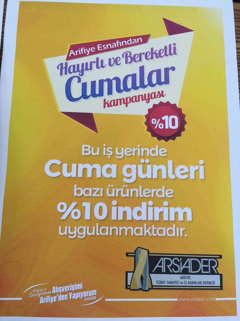 Arifiye Esnaf Sanayici ve İş Adamları Derneği ARSİADER’den ‘ARİFİYE’LİYİM ALIŞVERİŞİMİ ARİFİYE’DEN YAPIYORUM’Kampanyası sonrası yeni bir kampanya daha başlattı. Kara Cuma Değil “HAYIRLI VE BEREKETLİ CUMALAR” adı altından başlatılan kampanyanın afişleri hazırlandı.Hazıralanan afişlerin olduğu İş yerlerinde Şubat ayı boyunca Her Cuma Bazı Ürünlerde %10 İNDİRİM uygulanacak.