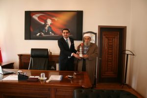 Kaymakamımız Orhan Gazi KARAKAŞ tarafından kapıda karşılanan Asım SAFİTÜRK amcamız, Kaymakamımıza Şehit Kaymakam Muhammet Fatih SAFİTÜRK anısına hediye takdim etti. Kaymakamımız ise Asım Amcamıza Sakarya Zaferinin anısına yaptırılan tarihi Zafer Kulesinin maketini hediye etti.