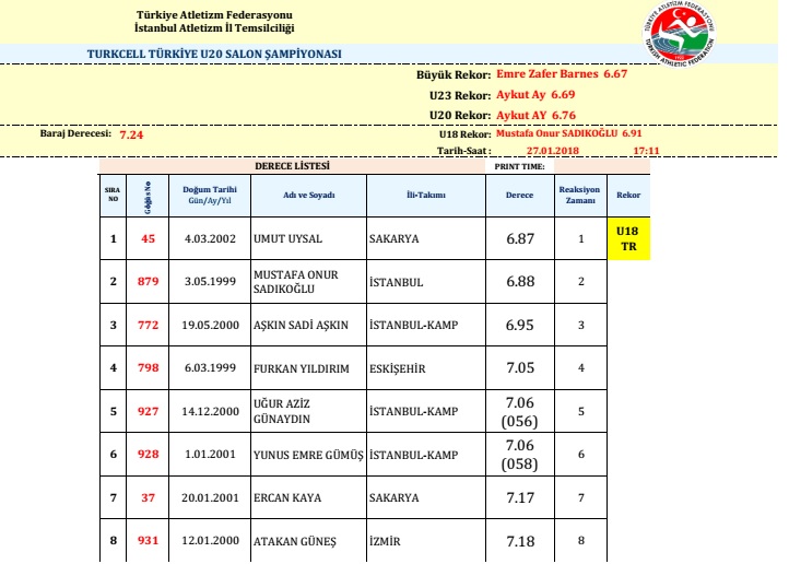 Sakarya Büyükşehir Belediyespor Kulübü Atletizm Takımı sporcularından Umut Uysal Turkcell Türkiye U20 Salon Atletizm Şampiyonası’nda 60 metre mücadelesinde 6.87’lik derecesiyle U18 (yıldızlar) kategorisinde salon rekoruna imza attı. Ataköy Atletizm Salonu’nda gerçekleştirilen turnuvada rekorun eski sahibi Mustafa Onur Sadıkoğlu’nu da geride bırakan Umut Uysal, Türkiye birinciliğini elde etti. Türkiye U20 Salon Atletizm Şampiyonası sonrasında Umut Uysal, 10 Şubat Cumartesi günü Sofya’da yapılacak olan ‘Balkan U20 Salon Şampiyonası’ için kamp kadrosuna dâhil edildi.