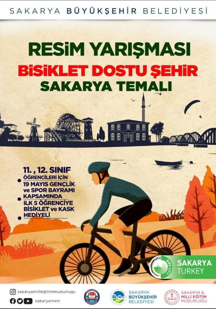 Bu kapsamda İl Milli Eğitim Müdürlüğü ve Sakarya Valiliği ortaklığında 19 Mayıs Atatürk’ü Anma, Gençlik ve Spor Bayramı’na özel bir resim yarışması başladı. Kent genelindeki tüm okulları kapsayacak şekilde organize edilen bu etkinlikte “Bisiklet Dostu Sakarya” sloganını en iyi şekilde anlatacak resmi çizen öğrenciler, ödül kazanacak.