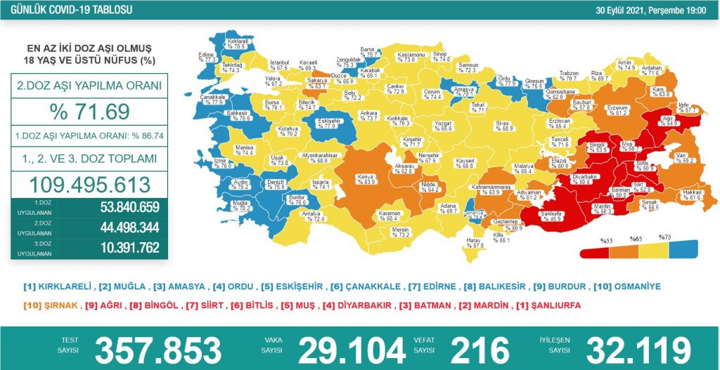 Son 24 saatte koronavirüs vakasında ülkemizde gerçekleşen son durum açıklandı. Son 24 saat içinde 357.853 yeni test yapıldı,vaka sayısı 29.104 olurken 32.119 kişi daha iyileşti.Bugün 216 kişi hayatını kaybetti.
