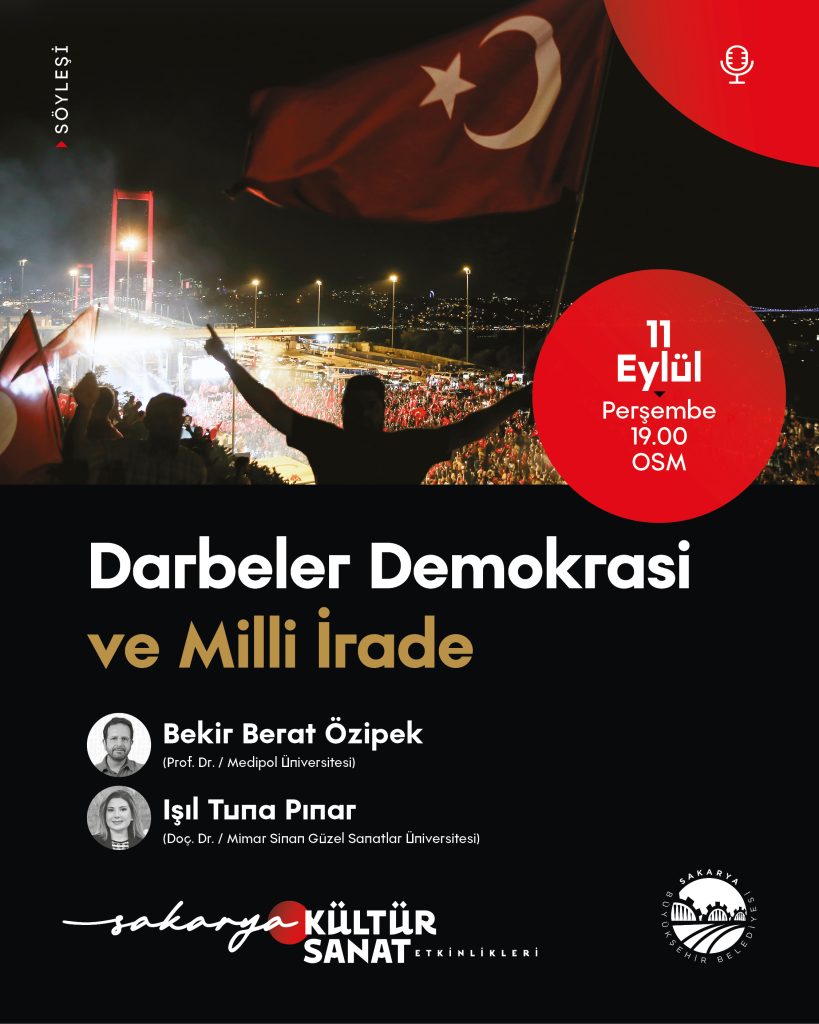 Sakarya Büyükşehir Belediyesi Kültür Sanat Etkinlikleri 11 Eylül Perşembe günü gerçekleştirilecek ‘Darbeler Demokrasi ve Milli İrade’ başlıklı söyleşi programı ile devam edecek.