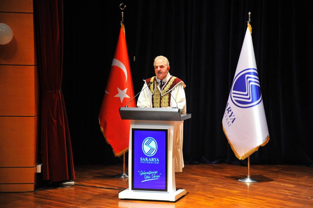Rektör Prof. Dr. Muzaffer Elmas da konuşmasında Sakarya Üniversitesinde bir hafta boyunca ön lisans, lisans, yüksek lisans ve doktora seviyelerinde verilen 14 bin mezun ile birlikte 180 bini aşan Sakarya Üniversiteli mezun sayısına ulaşmanın mutluluğunu yaşadıklarını dile getirdi. Prof. Dr. Elmas, “15 Temmuz’da FETÖ tarafından gerçekleştirilen darbe girişimi sonrası ülkemizde oluşan çalkantılı süreçten bugüne oluşan huzur ve güven ortamının sağlanmasında en önemli pay, vatanımız, huzurumuz ve güvenliğimiz için canını feda eden şehitlerimizindir. Bu vesile ile tüm şehitlerimize ve ayrıca hain saldırıda şehit olan Muhammet Fatih Safitürk’e Allah’tan rahmet diliyorum. 15 Temmuz darbe girişiminden sonra gençleri analitik düşünebilen, omurgası sağlam, değerlerine sahip çıkan, aklını kiraya vermeyen öğrenciler olarak yetiştirmenin üniversitenin öncelikli görevleri arasında olduğu görülmüştür” diye konuştu.