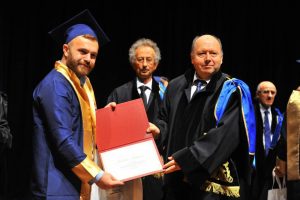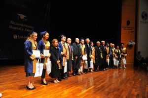 Dereceye giren öğrencilerin mezuniyet kütüğüne plaket çakmaları ile devam eden tören, öğrencilerin mezuniyet yeminini etmeleri ve keplerini havaya atmaları ile sona erdi.