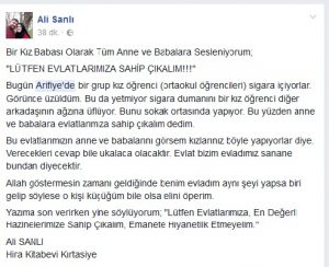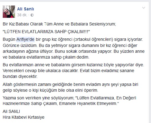 Arifiye İlçemizde esnaflık yapan Hira Kitap Kırtasiye sahibi Ali Sanlı bugün Arifiye’de gördüğü bir manzara karşısında dayanamayarak sosyal medya hesabı üzerinden anne ve babalara önemli bir çağrı yaptı.