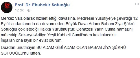 ‘Merkez Vaiz olarak hizmet ettiği davasına, Medresei Yusufiye’ye çevirdiği 12 Eylül zindanlarında da devam eden Büyük Dava Adamı Babam Ziya Şükrü Sofuoğlu çok istediği Hakka Yürütmüştür. Cenazesi Yarın Cuma namazını müteakip Sakarya-Arifiye Yeşil Kubbeli Camii’nden kaldırılacaktır.
