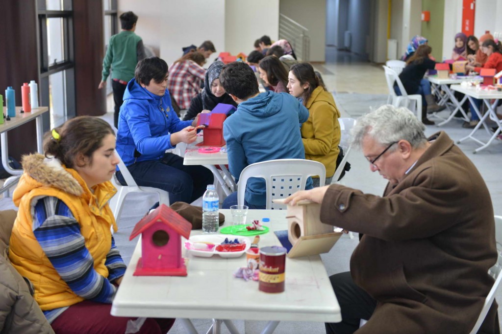 Rengârenk boyanan kuş evleri, etkinlik sonunda kampüsün çeşitli noktalarına yerleştirilecek.