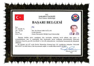 Sakarya Valiliği Özel Kalem Müdürlüğü tarafından Vali COŞ’un imzasıyla gönderilen belgede “İlimizde birlikte görev yaptığımız süre içerisinde, uhdenize tevdi edilmiş olan görev ve sorumlukların tam ve zamanında ifası hususunda mesai mefhumu gözetmeksizin göstermiş olduğunuz başarılı, gayretli, koordineli ve özverili çalışmalarınız tarafımdan memnuniyetle müşahede edilmiştir. Bu nedenle sizi 657 sayılı Devlet Memurları Kanunu’nun 122. Maddesine istinaden “Başarı Belgesi” ile taltif ediyor, tüm hayatınızda sağlık ve esenlikler diliyorum.” ifadesi yer aldı.