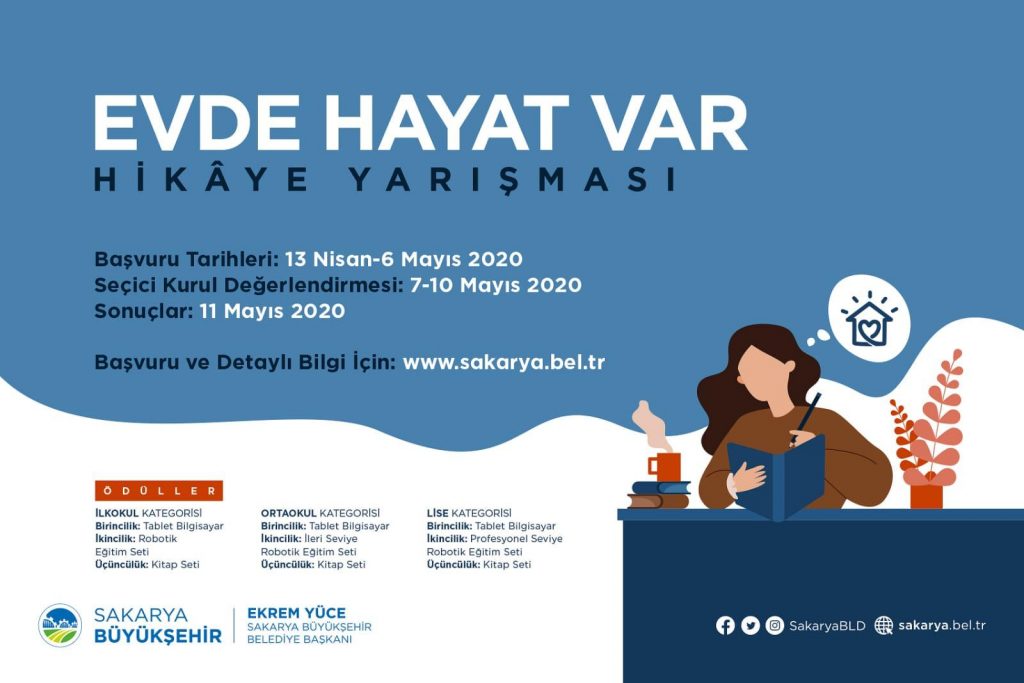 Yarışmayla ilgili Kültür ve Sosyal İşler Dairesi Başkanlığı tarafından yapılan açıklamada, “Koronavirüs ile mücadele kapsamında sokağa çıkması kısıtlanan gençlerimizin evde geçirdikleri zamanları daha verimli hale getirmeleri amacıyla ‘Evde Hayat Var’ adlı hikaye yarışması düzenledik. Bu yarışmaya şehrimizde ikamet eden ilkokul, ortaokul ve liseli gençlerimiz katılarak yeteneğini gösterebilir, heyecana ortak olabilirler, yarışmaya www.sakarya.bel.tr adresinden kolayca katılabilirler. İlkokul, ortaokul ve lise olmak üzere 3 ayrı kategoride düzenlediğimiz ve 6 Mayıs Çarşamba günü başvurularının sona ereceği yarışmamıza 300’e yakın başvuru aldık. Gençlerimizin büyük ilgi gösterdiği hikaye yarışmamızda dereceye girenlere ödüller takdim edeceğiz. Bu kapsamda 11 Mayıs Pazartesi günü www.sakarya.bel.tr adresinden sonuçların ilan edileceği ‘Evde Hayat Var’ hikaye yarışmasında 1.’nci olan gençlerimize tablet, 2.’nci olan gençlerimize robotik eğitim seti ve 3.’ncü olan gençlerimize kitap seti hediye edeceğiz. Birbirinden değerli ödüller için tüm gençlerimizi hikaye yarışmamıza katılmaya davet ediyoruz” denildi.