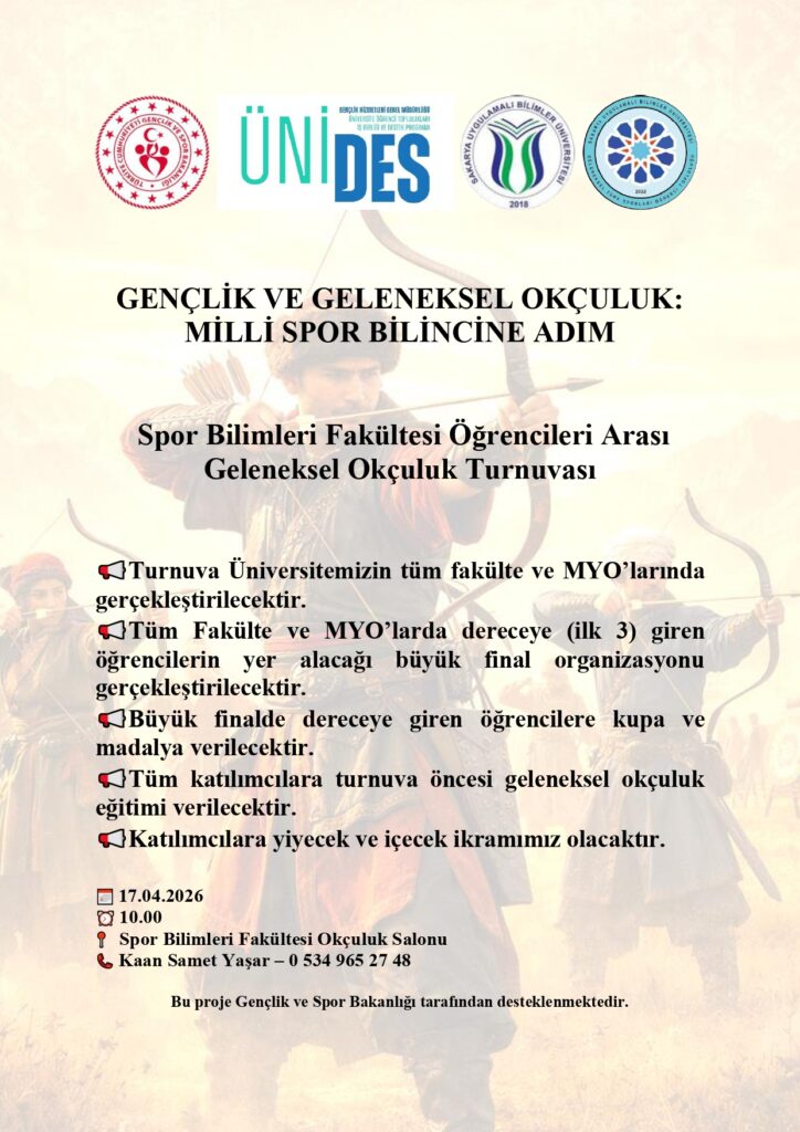 Sakarya Uygulamalı Bilimler Üniversitesi (SUBÜ) Geleneksel Türk Sporları Öğrenci Topluluğu, Gençlik ve Spor Bakanlığı’nın Üniversite Öğrenci Toplulukları İş Birliği ve Destek Programı (ÜNİDES) kapsamında desteklenen ‘Gençlik ve Geleneksel Okçuluk: Milli Spor Bilincine Adım’ projesi çerçevesinde Geleneksel Okçuluk Turnuvası düzenleyecek. Öğrencilerin sportif faaliyetlere katılımını arttırmak ve geleneksel sporları tanıtmak amacıyla planlanan proje kapsamında üniversitenin farklı fakülte ve meslek yüksekokullarından öğrenciler sürece dâhil olacak. Programda katılımcılar öncelikle geleneksel okçuluk eğitimleri alacak, ardından birimlerde düzenlenecek turnuvalarla performanslarını sergileme ve rekabet ortamında deneyim kazanma imkânı bulacak. Süreç boyunca geleneksel okçuluk kurallarına uygun yarışmalarla öğrenciler arasında sosyal etkileşimin arttırılması ve geleneksel spor kültürünün yaşatılması hedeflenecek. Eğitim ve turnuvaların tamamlanmasının ardından birimlerinde derece elde eden katılımcılar arasında final müsabakaları yapılacak.