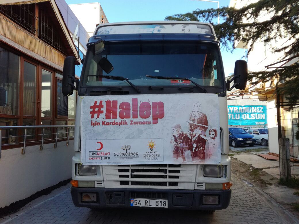 Sevgi Mektebi Derneği (SEVMEKDER), AK Parti İl Kadın Kolları ve Kızılay Sakarya Şubesi Başkanlığınca bir süredir toplanan kışlık giysi, ayakkabı, oyuncak ve battaniyeler paketler halinde hazırlandı. Hazırlanan paketler sabah saatlerinde TIR’a yüklenerek, dualar eşliğinde Suriye’nin Halep kentine götürülmek üzere yola çıktı.