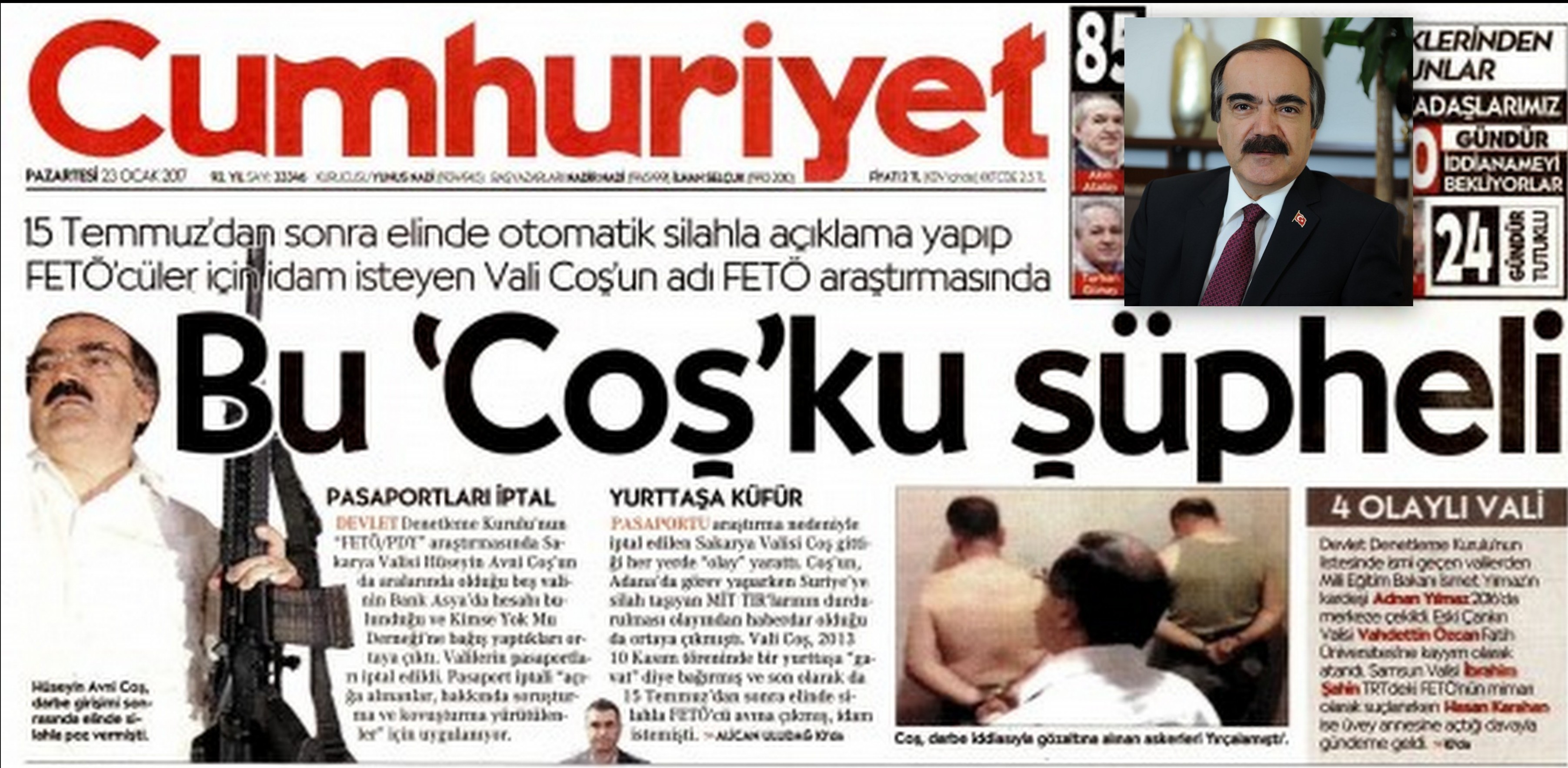 Bugün Cumhuriyet Gazetesi manşetinde yer verdiği ve Cumhurbaşkanlığı’na bağlı Devlet Denetleme Kurulu raporuna dayandırdığını ileri sürdüğü haberde Vali Hüseyin Avni Coş’un adının FETÖ soruşturmasında olduğunu ve yurt dışı yasağı bulunduğunu iddia etti.