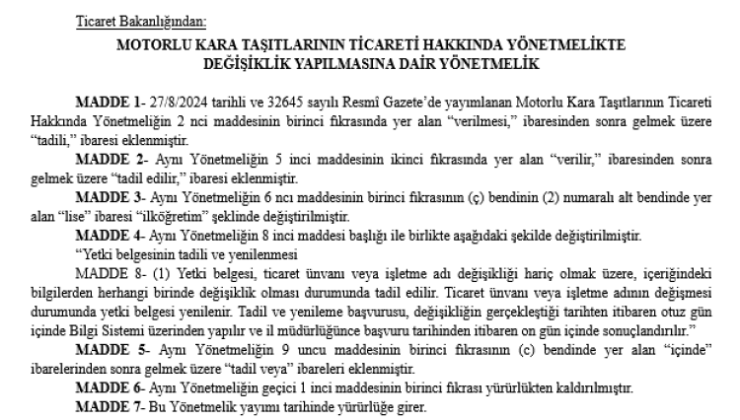 Ticaret Bakanlığı, motorlu kara taşıtı ticaretine ilişkin yönetmelikte değişikliğe gitti; yetki belgelerinde “tadil” süreci tanımlanırken eğitim şartı da liseden ilköğretime çekilerek esnetildi.