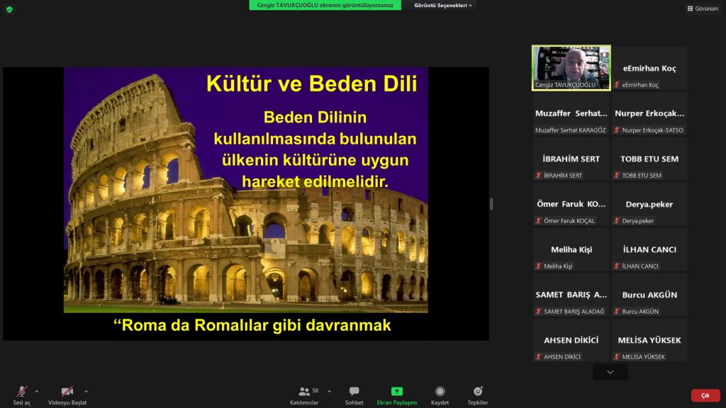 Dr. Cengiz Tavukçuoğlu iletişimin insan ilişkilerindeki yeri, iletişim süreci, algı ve algı yönetimi, temel iletişim becerileri gibi birçok konuda ayrıntılı bilgi aktardığı eğitimde iletişimin her kanaldan, her durumda gerçekleşebileceğini, susarak bile iletişimin kurulabileceğini belirtti. El hareketleriyle olan iletişimin her ülkede aynı anlaşılmadığı konusunda katılımcıları uyararak seyahatlerde el hareketlerinden uzak durulması önerisinde bulundu.