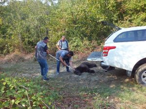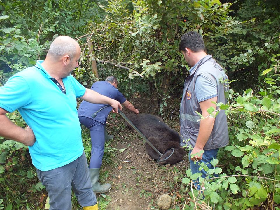 Akçay Mahallesinde geçtiğimiz günlerde ormanlık alanda kimin kurduğu belirlenemeyen domuz kapanına yakalanan boz ayı, Orman ve Su İşleri Sakarya Şube Müdürlüğü ekiplerince kurtarıldı.