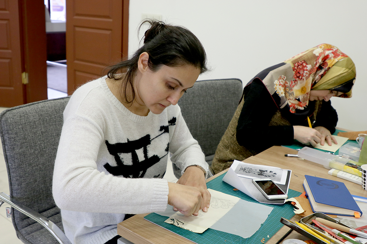 Kat-ı Sanatı hakkında bilgiler veren eğitmen Alev Uzun, “Kat-ı Sanatı, eski Osmanlı Saray sanatından biridir. Kat’ı hem sarayda hem de çarşıda ressamların yaptığı oldukça yaygın bir sanattır. Herhangi bir motifin kâğıda geçirilip, oradan kesilip başka bir kağıda geçirilmesiyle elde edilen bir sanat olan Kat’ı birçok sanatı içinde barındırır. Fazlasıyla sabır isteyen bir sanat Kat’ı. İnce işçiliği fazla olan bir sanat. Bu sanatın diğer sanatlardan ayrılan yanı yapıştırma işlemi uygulamamız. Kestiğimiz kağıtları zemine yapıştırıyoruz. Temel olarak makas ve keski kullanabilmeleri için basit örneklerden başlıyoruz. Her konu değiştiğinde örnekler biraz daha zorlaşıyor. En basitten başlayıp zora doğru ilerliyoruz. Kursiyerler, bu sanatı zevk alarak yapıyorlar. Kendilerini geliştirmiş oluyorlar” ifadelerini kullandı.