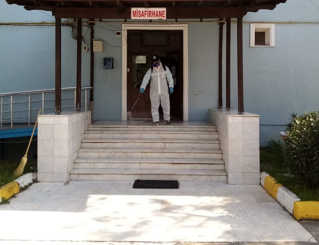 Sakarya Büyükşehir Belediyesi koronavirüs ile mücadele kapsamında şehrin tüm noktalarında çalışmalarını titizlikle sürdürüyor. Vatandaşları koronavirüs salgınından korumak adına adeta seferberlik ilan eden Büyükşehir Belediyesi, Başkan Ekrem Yüce’nin talimatlarıyla dezenfekte çalışmalarını tüm şehir genelinde devam ettiriyor. Bu kapsamda Büyükşehir dezenfekte ekipleri kamu kurum ve kuruluş binalarını, Pazar yerlerini, sokağa çıkma kısıtlamasının uygulandığı günlerde fırınları ve nöbetçi eczaneleri virüslere karşı dezenfekte etmeye devam etti. Dezenfekte ekipleri ayrıca Başkan Ekrem Yüce’nin talimatlarıyla sağlık çalışanlarının kaldığı otel ve misafirhaneleri de düzenli olarak dezenfekte ediyor.