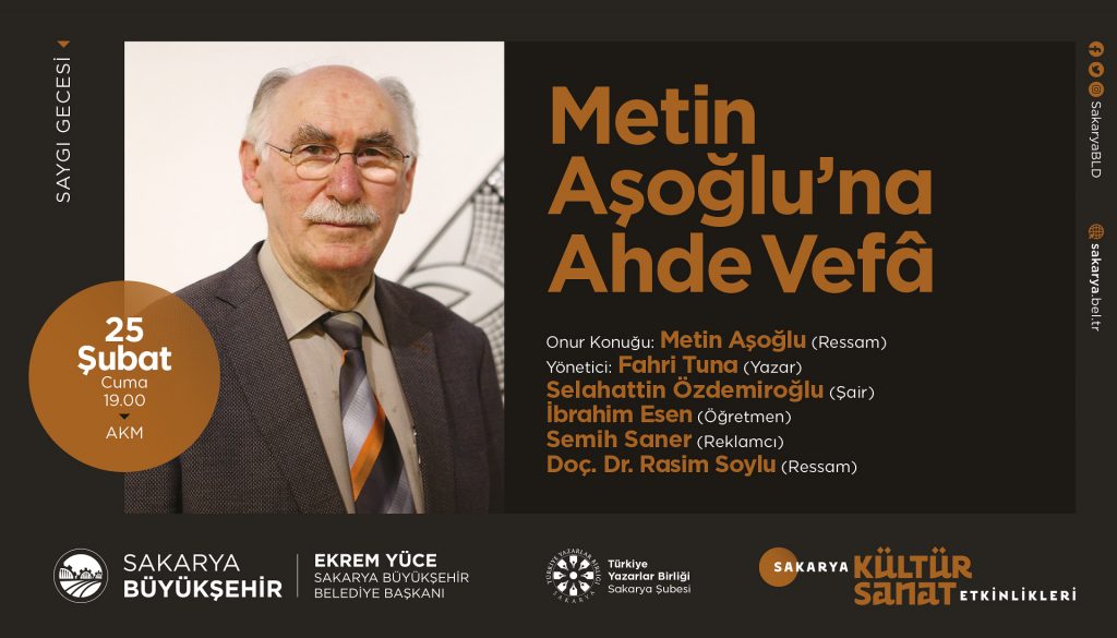 Sakarya Büyükşehir Belediyesi’nin kültür ve sanat dolu programları hız kesmeden sürüyor. Birbirinden kıymetli konukların ağırlandığı Şubat Ayı Kültür Etkinlikleri programı Türkiye’nin yakından tanıdığı ressam Metin Aşoğlu için düzenlenecek vefa programı ile devam edecek.