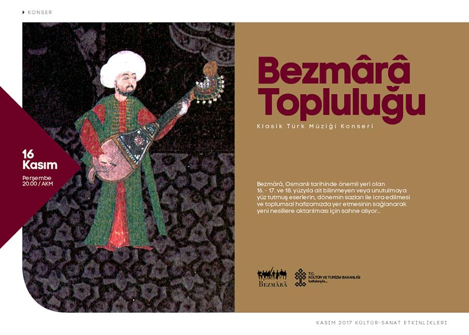 Sakarya Büyükşehir Belediyesi Kasım Kültür Sanat Etkinlikleri 16 Kasım Perşembe günü iki program ile devam edecek. Günün ilk etkinliğinde Klasik Türk Müziği Konseri’nde Bezmara Topluluğu müzikseverlerle buluşacak. Adapazarı Kültür Merkezi’nde gerçekleştirilecek etkinlik saat 20.00’da başlayacak.