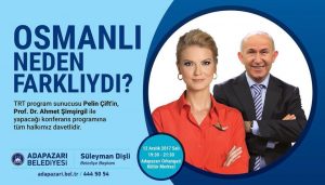 Adapazarı Belediyesi’nin düzenlediği organizasyonla “Osmanlı Neden Farklıydı?” konulu konferans için TRT’nin başarılı Program Sunucusu Pelin Çift ve Prof. Dr. Ahmet Şimşirgil hoca Orhan Gazi Kültür Merkezinde 12 Aralık Salı günü ,Saat 19:30’da Sakarya’lılar ile buluşuyor.