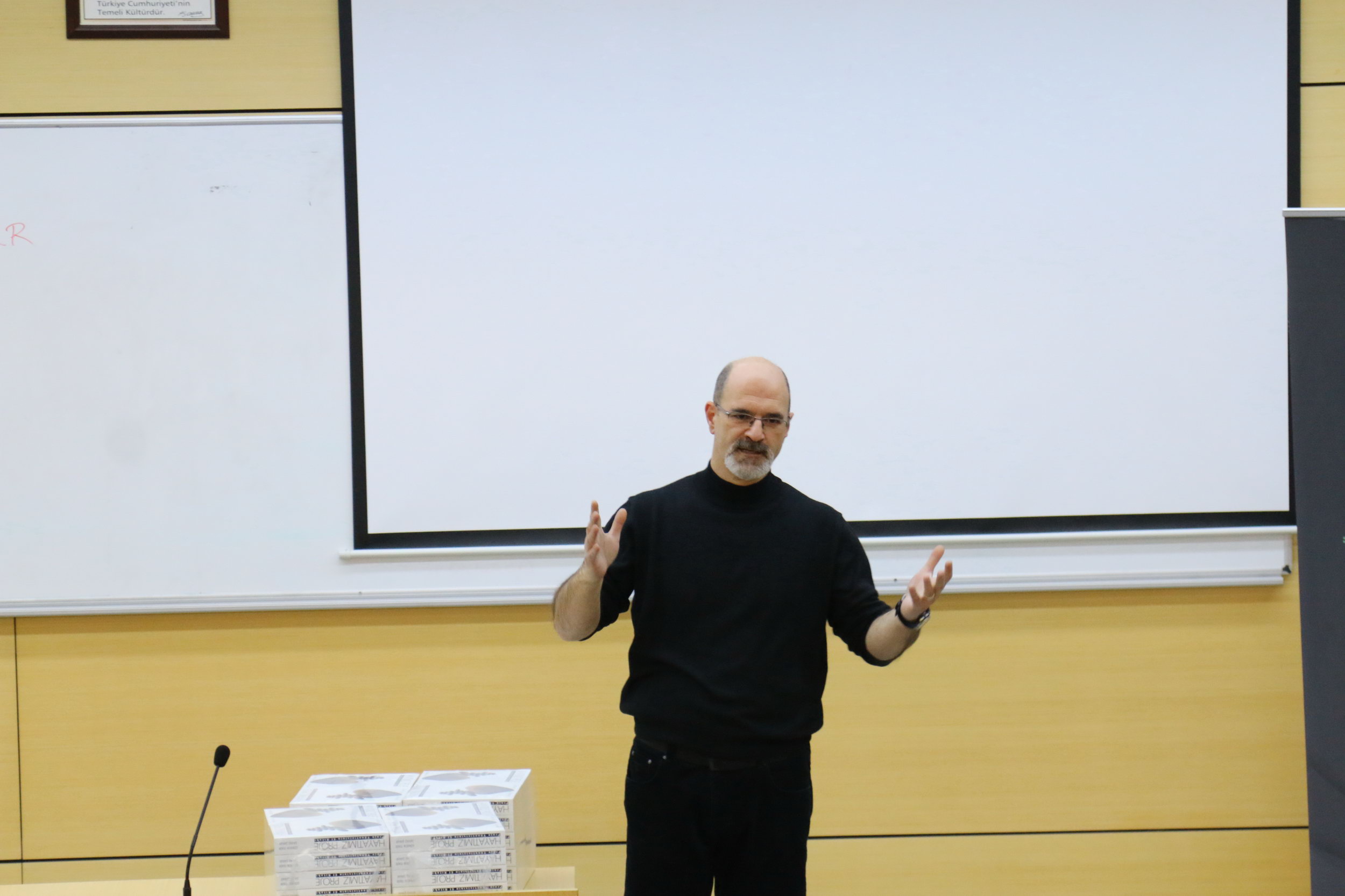 Savaş Şakar, proje yönetimi alanına nasıl başladığını anlatarak, proje yönetiminin ne olduğu ve doğru olarak nasıl yapılması gerektiği konularında öğrencileri bilgilendirdi. Hayat şartlarının kendisini “olması gerektiği gibi” olarak tanımladığı proje yönetimine sevk ettiğini söyleyen Şakar, şöyle devam etti: “Olması gerektiği gibi proje yönetimi ne demektir? Projeye çıraklıktan başlarsınız. Sonra kalfalık, ustalık, uzmanlığa doğru gidilen klasik evrensel bir yolu izlersiniz. Türkiye’de proje yöneticilerinin yüzde 90’ı kazara proje yöneticisi olmuşlardır. Bunun anlamı şu; bir branşta eğitiminizi tamamlayıp işe başlarsınız. Sizi muhasebeye, pazarlamaya herhangi bir departmana alırlar. Size bahsettikleri görev tanımlarına göre o departmanda o işi yapacağınızı düşünürsünüz. Ama ilerde o şirkette bir proje ortaya çıkar. O projeyi yönetmek için bazen en nitelikli adamı seçerler ve projeyi yönetmesini isterler. O kişi birden kendini proje yöneticisi olarak bulur. İş hayatı size baskı kurar, istediğinizi yapmanıza izin vermez.”