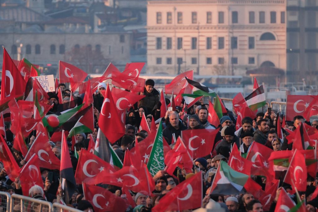 Filistin’le ilgili söylenen şarkılara katılımcılar hep bir ağızdan eşlik ederken, yerli ve yabancı çok sayıda basın mensubu da kurulan platformlardan eylemi takip etti.