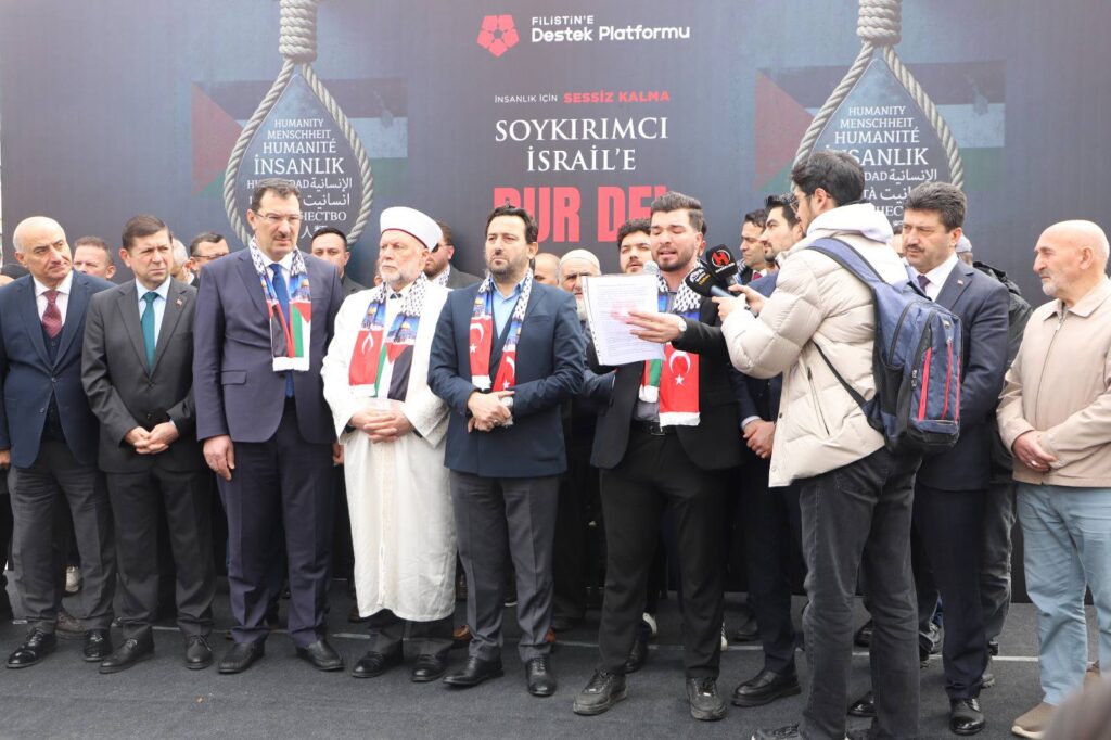 Sakarya Üniversitesi İletişim Fakültesi öğrencisi Abdülgani Sadık tarafından okunan basın açıklamasında, uluslararası kamuoyunun sessizliğine tepki gösterilerek, yaşananların insanlık vicdanını yaraladığı vurgulandı. Sadık, konuşmasında Filistin’de yaşanan insan hakları ihlallerine dikkat çekerek, uluslararası kamuoyunu daha fazla sorumluluk almaya davet etti. Açıklamada, bölgede sivillerin maruz kaldığı şiddetin kabul edilemez olduğu vurgulandı.