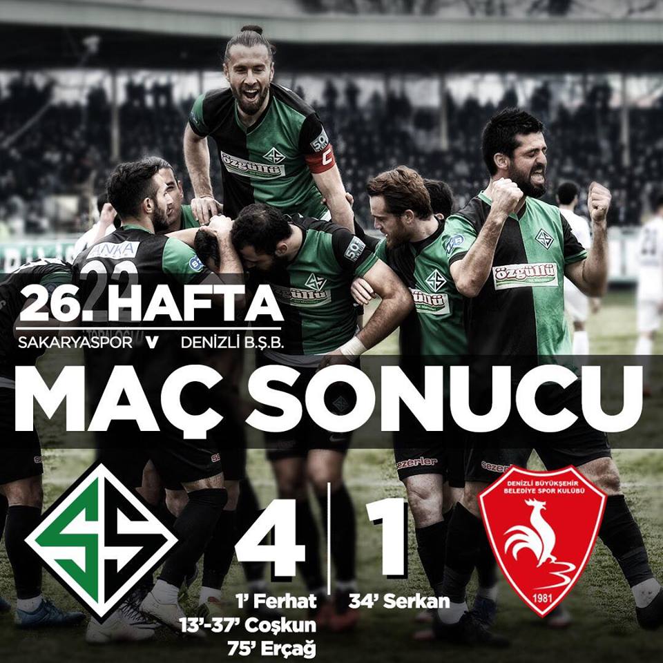 Spor Toto 3.Lig’in 26.haftasında Sakaryaspor kendi sahasında ağırladığı Denizli Belediyespor’u 4-1 mağlup etti.Takımda golleri Ferhat Yazgan,Coşkun Yılmaz(2),Erçağ Evirgen kaydetti. Sakaryaspor bu galibiyetle puanını 51’e çıkararak 3.sırada ki yerini koruyor.