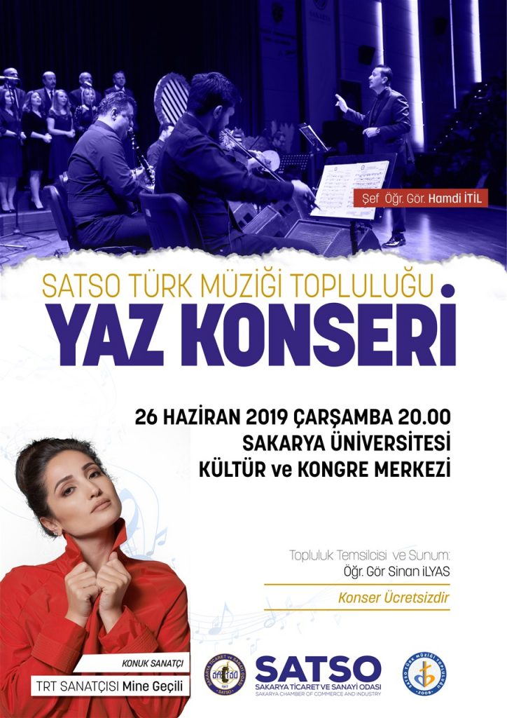26 Haziran 2019 Çarşamba günü saat:20.00’de Sakarya Üniversitesi Kültür ve Kongre Merkezinde gerçekleştirilecek konser ile ilgili davette bulunan SATSO Yönetim Kurulu Başkanı A. Akgün Altuğ “Her defasında Sakaryalılar tarafından ilgi ile karşılanan, keyifli ve başarılı çalışmaları ile takdiri hak eden SATSO Türk Müziği Topluluğumuz yaz konseri için titizlik ve heyecanla çalışmalarını yürütüyor. TRT Sanatçımız Mine Geçili’nin konuk olarak iştirak edeceği SATSO Türk Müziği Topluluğumuzun, amatör bir ruhla büyük özverilerle yapılan çalışmaların bugün profesyonel bir noktaya ulaştığını görmekten SATSO ve Sakarya adına gururluyuz.Koromuzun, musiki dolu keyifli bir akşam sunacakları ‘Yaz Konseri’ne, Sakaryalıların katılımından memnuniyet duyacağız.