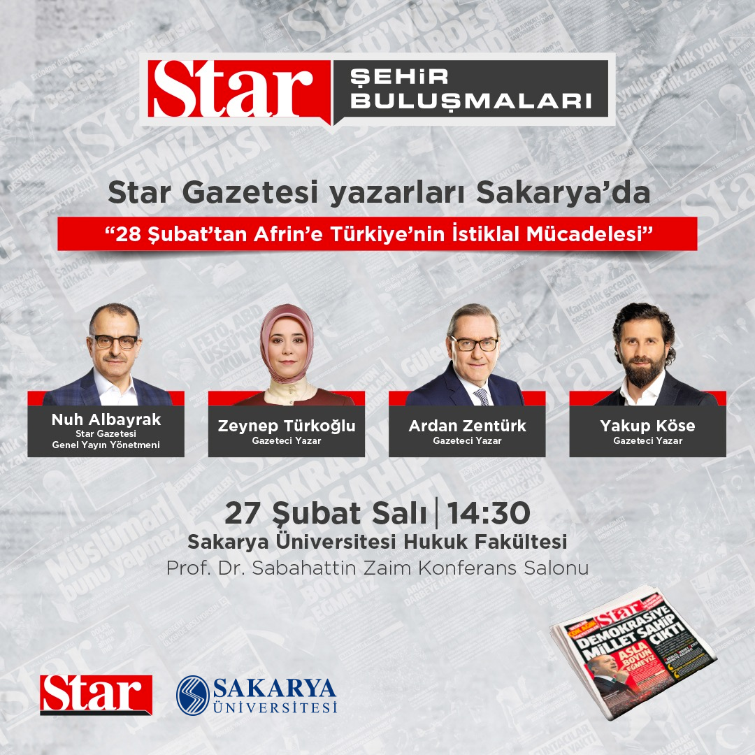 Star Gazetesi Genel Yayın Yönetmeni Nuh Albayrak, Gazeteci Yazar Zeynep Türkoğlu, Gazeteci Yazar Ardan Zentürk ve Gazeteci Yazar Yakup Köse’nin konuşmacı olarak katılacağı Star Şehir Buluşmaları Sakarya programının açılışı Sakarya Valisi İrfan Balkanlıoğlu, Sakarya Üniversitesi Rektörü Prof. Dr. Muzaffer Elmas, Sakarya Büyükşehir Belediye Başkanı Zeki Toçoğlu tarafından yapılacak.