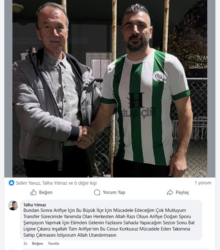 Lige verilen devre arasında dış transferde Arifiye Doğanspor ile anlaşma sağlayan Talha YILMAZ ile ilgili yaptığımız haber üzerine Arifiyelilere mesaj geldi.