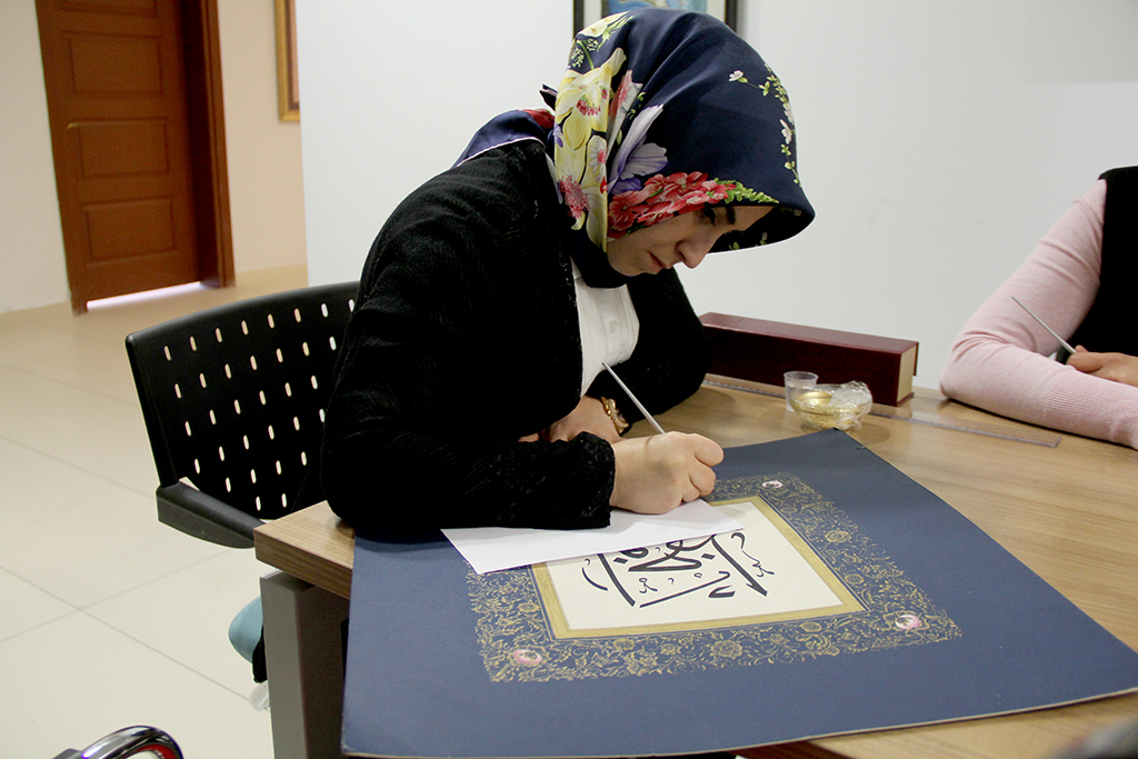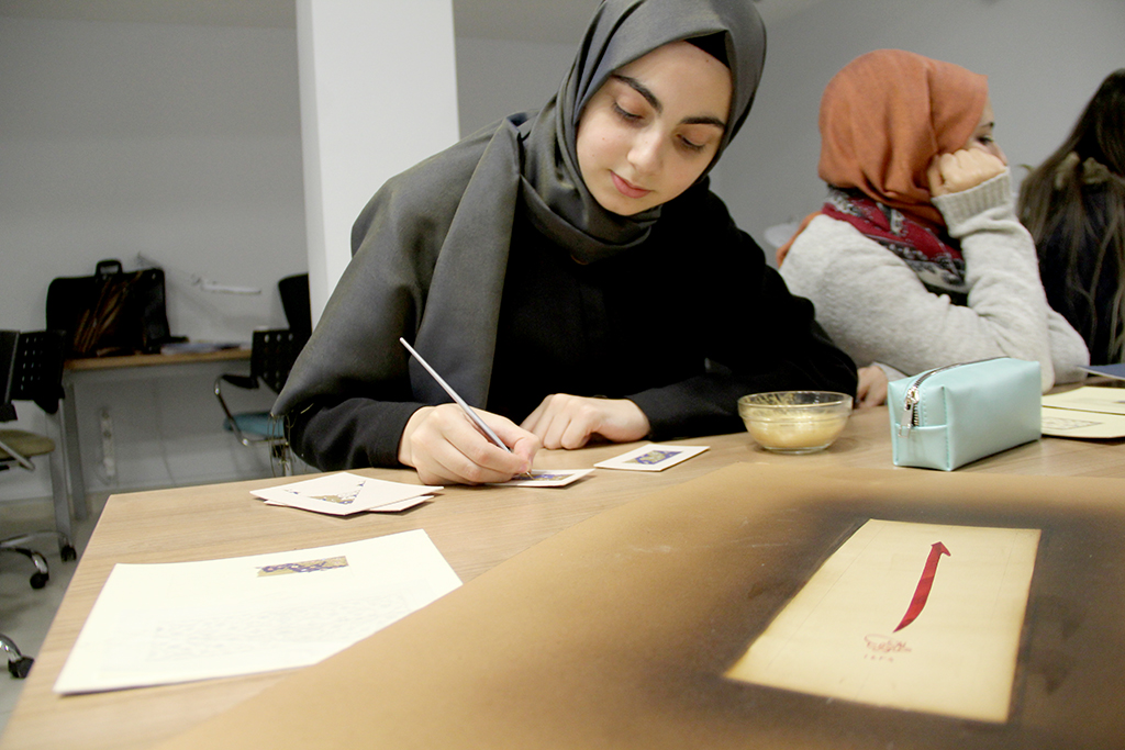 Tezhip dersinin işlenişi ile ilgili bilgiler veren Tezhip branşı eğitmeni Betül Esgimus, “Tezhip’e öncelikle yaprak çalışmaları ile başlıyoruz. Daha sonra goncalar, pençler ve klasik dönemde kullanılan konuları çalışmalarımıza ekliyoruz. Derslerimizde öğrencilerin eserlerinde kompozisyon yani konu bütünlüğü kurabilmesi bizler için oldukça önemli. Eğitimlerimizde klasik çalışmalara daha fazla ağırlık veriyoruz. İnşallah yılsonunda da eserlerimizi güzel bir sergiyle sanatseverlerle buluşturacağız. Tezhip, sabır ve tevazunun sanatıdır. Bu sanatla öğrenilen deneyimler her zaman artı değer katacaktır” diye belirtti.