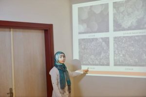 Gerçekleştirilen seminerde teknik seramiklerden hegzagonal bor nitrür (h-BN) tozu üretiminin proje ara sonuçlarını paylaşan proje asistanı Fulden Doğrul, Ali Osman Kurt’un patentini aldığı ve kendisi tarafından yeni geliştirilen Dinamik Karbotermal İndirgeme ve Nitrürleme (DKTİN) yöntemi ile gerçekleştirdiği deneylerde, literatürde raporlanan en iyi çalışmalardan çok daha iyi sonuçlara ulaştıklarını söyledi. Doğrul, nano boyutta hegzagonal bor nitrür tozu üretebildiklerini ve bu yeni üretim yöntemi üzerinde daha fazla çalışılması ile çok daha iyi sonuçlara ulaşılabileceğini belirterek, bu yöntemle (AlN, BN, TiN, Si3N4 gibi) sadece nitrür esaslı teknolojik seramik tozları değil bunun yanında karbür ve borür esaslı yüksek katma değerli teknik seramik tozlarının da ekonomik olarak elde edilebileceğini de sözlerine ekledi.