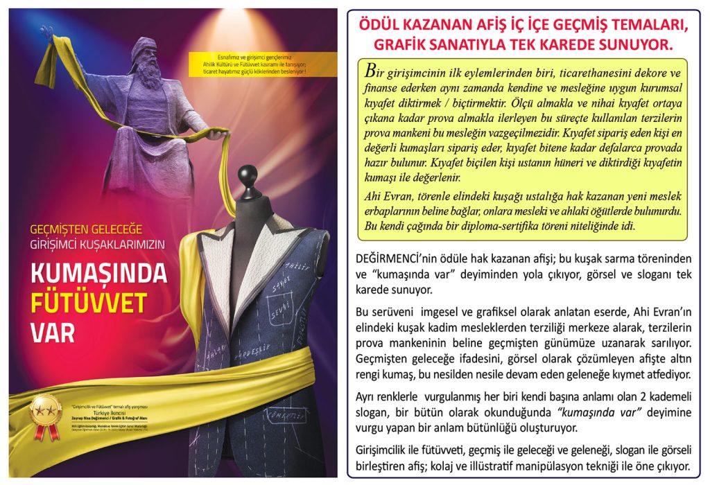 Ahi Evran, törenle elindeki kuşağı ustalığa hak kazanan yeni meslek erbaplarının beline bağlar, onlara mesleki ve ahlaki öğütlerde bulunurdu. Bu kendi çağında bir diploma-sertifika töreni niteliğinde idi. DEĞİRMENCİ’nin ödüle hak kazanan afişi; bu kuşak sarma töreninden ve “kumaşında var” deyiminden yola çıkıyor, görsel ve sloganı tek karede sunuyor.