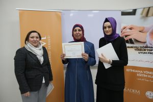 KADEM İl Temsilcisi Zehra Toçoğlu, “3 ay önce lansmanını yaptığımız projemizin ilk etabının tamamlanmasının mutluluğunu paylaşıyoruz. KADEM olarak kadın meselelerine asla duyarsız kalmıyor ve kadınların hayatına dokunabilmek onların toplumla arasındaki ilişkiyi düzenlemek üzerine projeler üretiyoruz. Bu projelerimizden biri de Suriyeli Sığınmacı Kadın ve Ailelerine Yönelik Toplumsal Uyum projesiydi. İlk olarak Türkçe Dil Kursları Eğitimi verdik. Ardından dikiş atölyesinde yaklaşık 30 sığınmacı kadına mesleki eğitim dersi sunduk. Kadınların eğitim aldıkları alanda uzmanlaşmalarını sağlamak adına Sakarya’da tekstil sektöründe hizmet veren firmalar ile görüşmelerimiz devam etmektedir. KADEM olarak her daim kadınlara dokunmayı amaçlıyor ve bu konuda çalışmalar yapıyoruz” dedi.