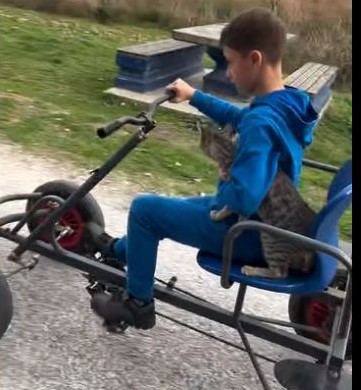 Geçtiğimiz günlerde Gölya’ya gezmeye gelen bir çocuk ziyaretçi yolda bulduğu kediyi yanına alarak dört tekerli bisiklet ile gezdirdi.